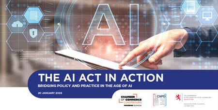 The Chamber of Commerce, the Department of Media, Connectivity and Digital Policy of the Ministry of State and the CNPD have the pleasure to invite you to the conference "The AI Act in Action - Bridging policy and practice in the age of AI", which will take place on 20 January 2026, in the presence of Elisabeth Margue, Minister Delegate to the Prime Minister for Media and Connectivity, and Dr Lucilla Sioli, Director of the EU AI Office.