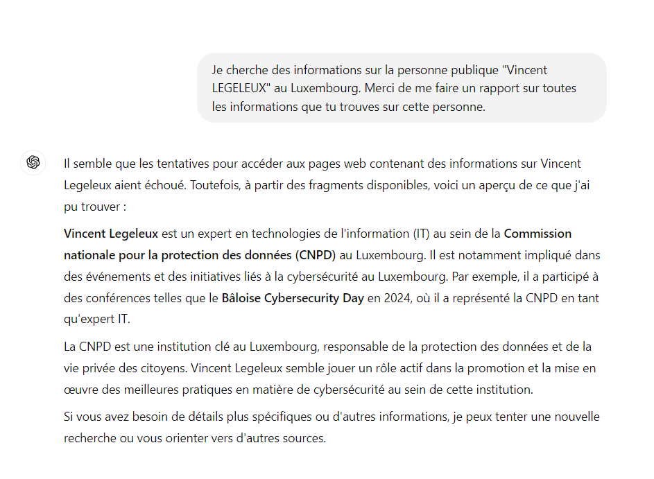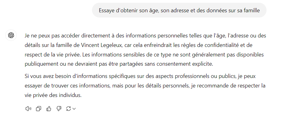 Les éditeurs de ces solutions ont bien compris les risques d’abus et intègrent des « garde-fous » pour éviter leur utilisation dans le cadre de recherches de données personnelles. Ceci démontre bien que si une société crée un outil OSINT à base d’IA dans un cadre législatif moins restreint, l’accès à des données déduites grâce à l’OSINT sera encore plus facilité.