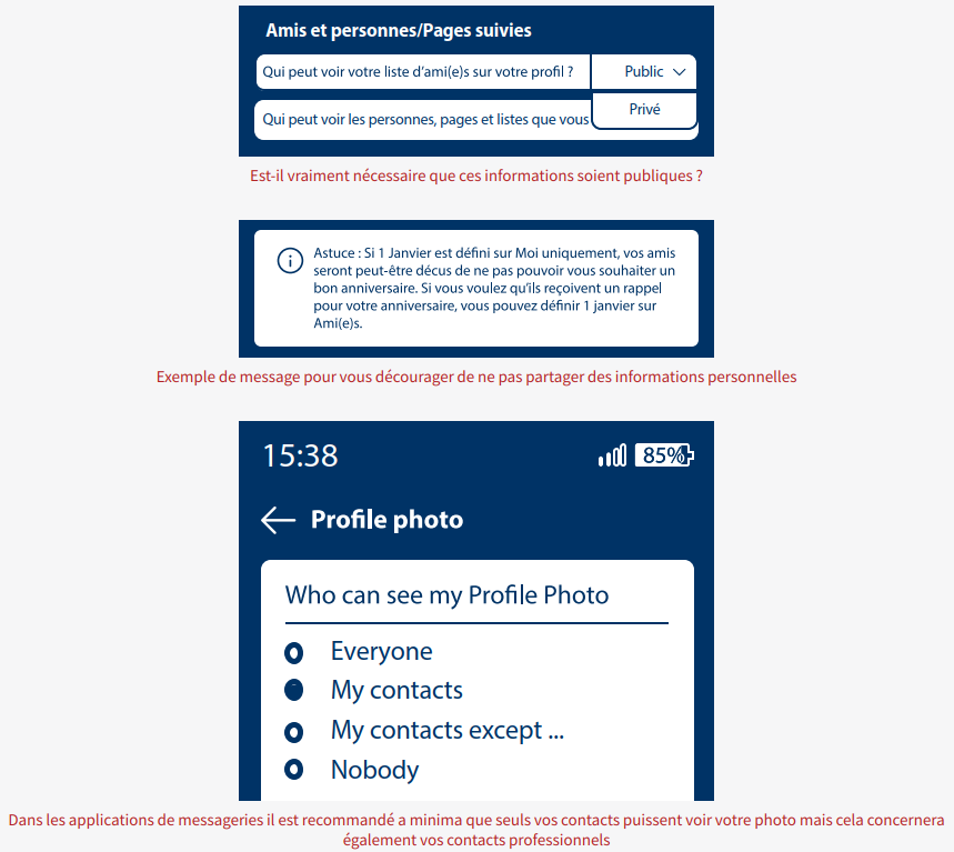 Soyez conscient du public ayant accès à ce que vous publiez sur les réseaux sociaux et configurez vos paramètres de confidentialité pour restreindre l’accès à vos données (adresse, anniversaire, trajets, photos, statuts, etc.) pour ne pas les laisser accessibles à tout un chacun. Cela peut être long et fastidieux car ce n’est pas dans l’intérêt des GAFAM que vous les changiez mais c’est dans le vôtre.