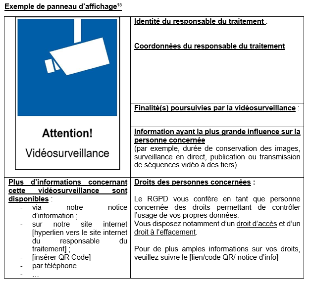 Afin d’informer les personnes concernées de la présence d’un système de vidéosurveillance, la CNPD recommande de communiquer, par exemple via des panneaux d’affichages, un premier niveau d’informations contenant :